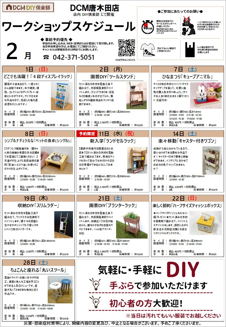 『2月のDIY教室スケジュール(唐木田店)』のご案内