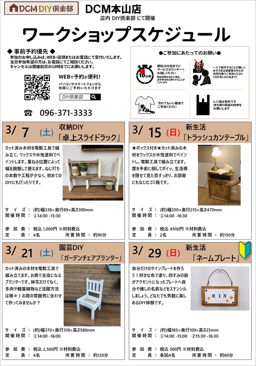 『3月のDIY教室スケジュール(本山店)』のご案内