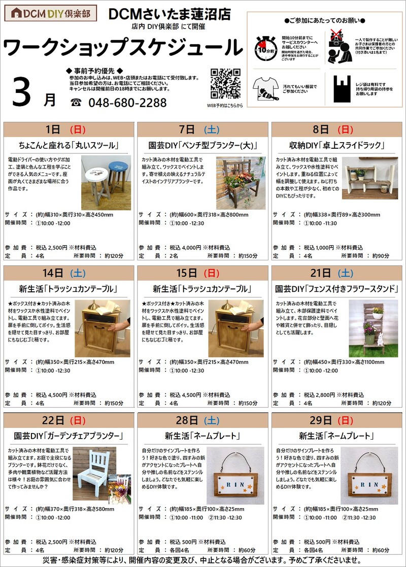 『3月のDIY教室スケジュール(さいたま蓮沼店)』のご案内