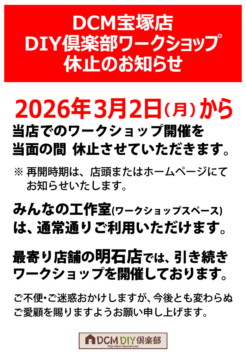 DIY倶楽部 宝塚店ワークショップ休止のお知らせ