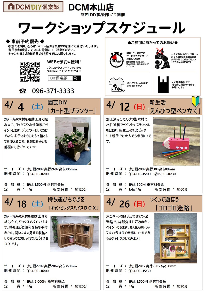 『4月のDIY教室スケジュール(本山店)』のご案内