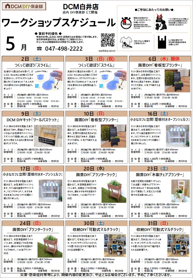 『5月のDIY教室スケジュール(白井店)』のご案内