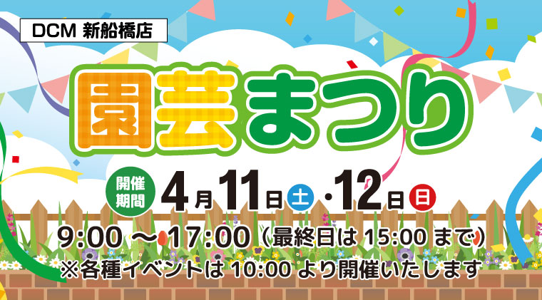 04月11日(土)~04月12日(日)11日(土) 9:00~17:00 12日(日) 9:00~15:00 ※各種イベントは10:00より開催いたしますDCM新船橋店 園芸まつり開催