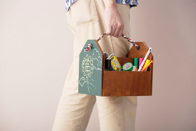 卓上の小物をオシャレに収納するツールボックス。側面の黒板にはメッセージも書けます。取っ手のヒモを替えれば壁掛け仕様に変身できます。