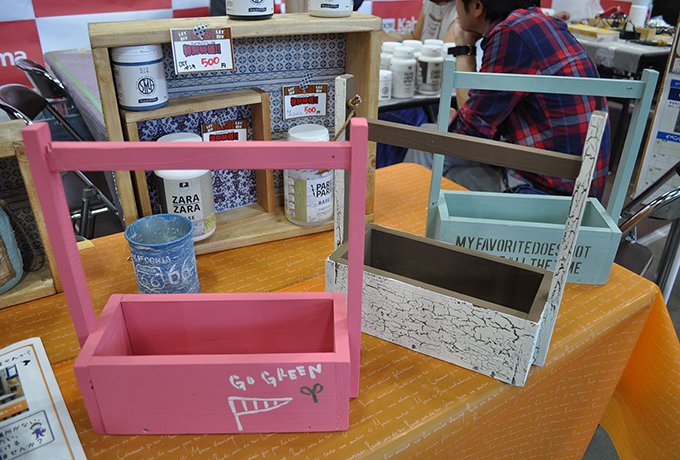 とても可愛いインテリアに、持ち運びが出来る小物入れにピッタリのアイテム。屋内外で使用できるマットでおしゃれな風合いの「DIYペンキ」を使って、お好みのカラーにペイントし、ステンシルやアンティーク加工で仕上げていただきました♪
