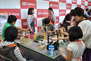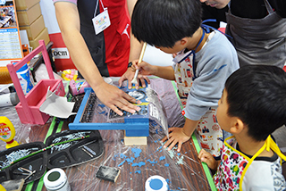 組立には電動ドリルを使用。初めての体験に子供さんも真剣になります。使用している「DCMブランド コードレス電動ドライバー」は、これまでのDIYイベントでも、”子供の小さな手でも使いやすい!””ドリルの速さがゆっくりで初めてでも恐くない!”と好評!今回も大活躍です★兄弟で同じエプロンをして色塗りをする微笑ましい姿も♪たくさんの種類から選んだステンシルステンシルも、DIYスタッフに塗り方をしっかり聞いて、上手に仕上げてくれました。完成した喜びは最高ですね♪