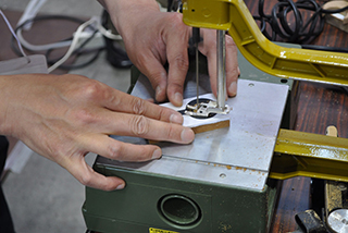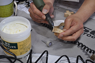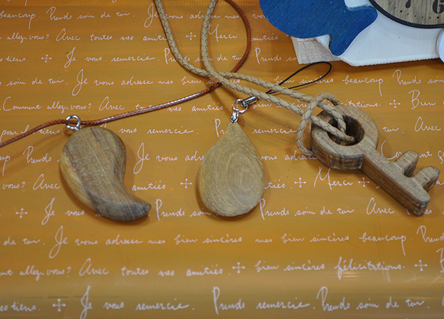 電動糸ノコで木材をカット、ルーターやサンダーで研磨して、優しい温もりのキーホルダー・アクセサリー作りを体験していただきました。