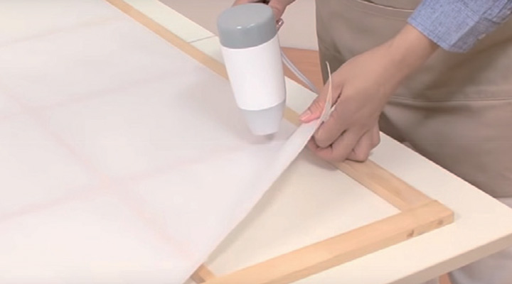 ⑥ 霧吹きで水を全体にスプレーして完成。こうしておくと、貼った後多少緩んでいても、ピンと張った仕上がりになります。