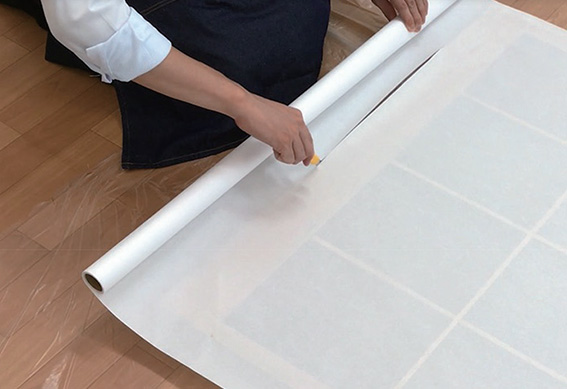 ② 位置決めのテープを貼ったままで、初めの状態に巻き戻し、枠の外に置きます。