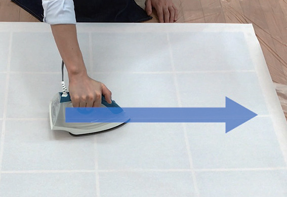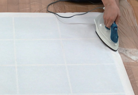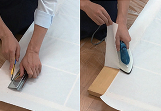 ① 紙の裏表を確認し、貼る位置を決めます。紙が曲がらないように気を付けながら、アイロンで四隅を仮止めします。