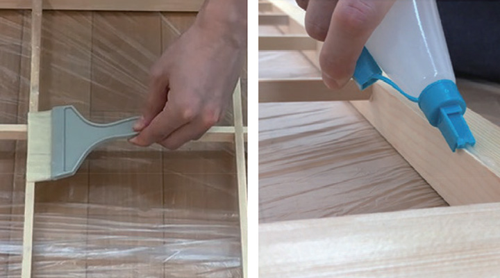 ③ 【水溶きのりの場合】水でのりを溶かし、刷毛の側面で桟にのりを付けます。【スティックタイプの場合】先端を桟にあて、スライドしながらのりを付けます。