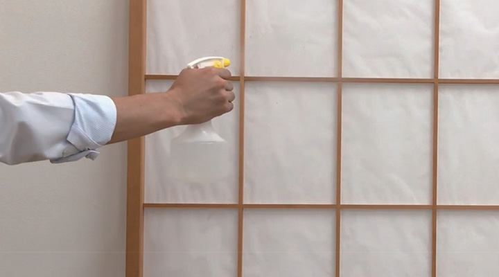 ② のり付きの面を表にして、はがし剤を桟に塗り、3~5分ほどおきます。また、はがし剤がない場合はお湯をたっぷりとスプレーすると良いでしょう。