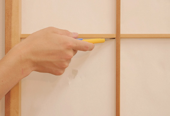 ① カッターかカミソリで、破れた障子紙をマスごと切りとります。