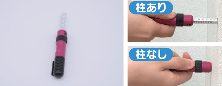 先端に付いた針を壁に垂直に差し込んで手応えがあれば裏側に柱があります。なければ何もなし。わかりやすくコンパクトな道具です。