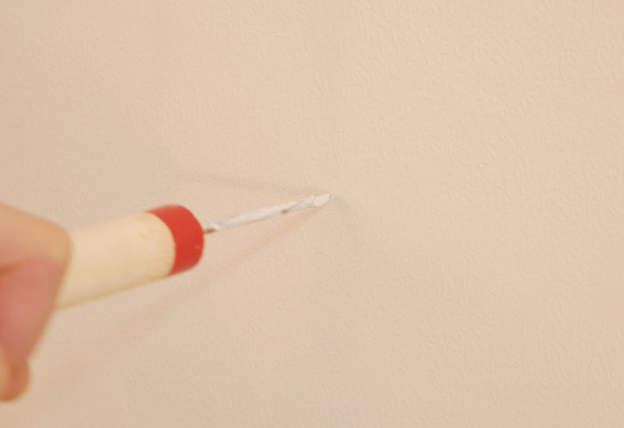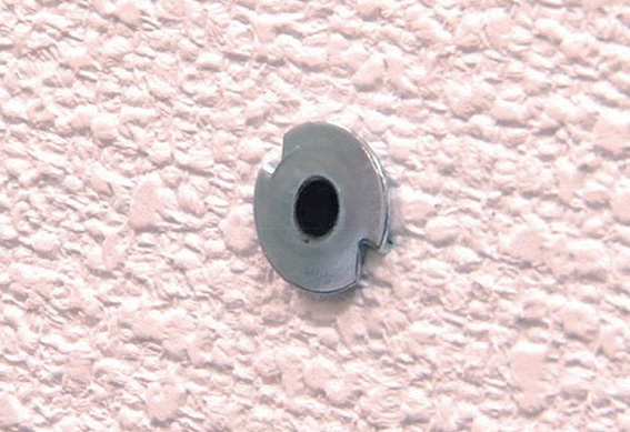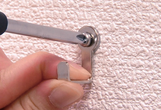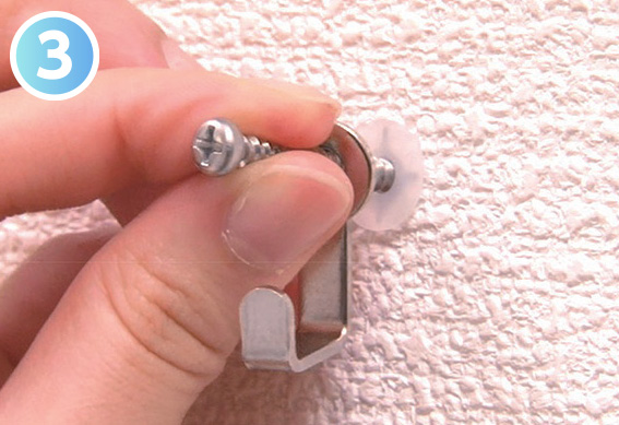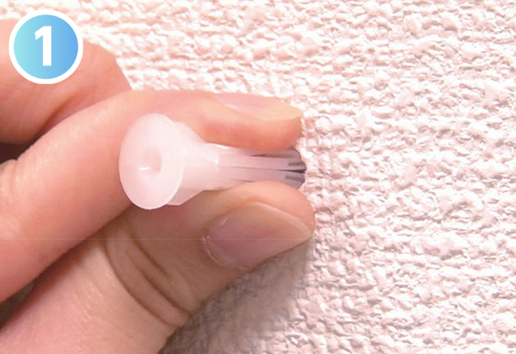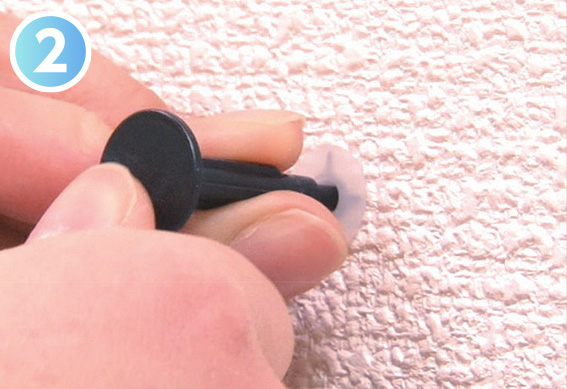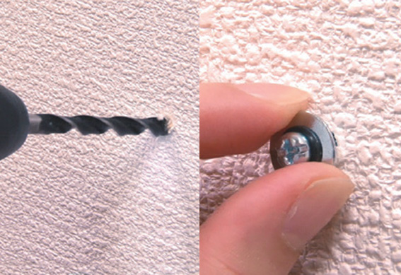 ① 下穴を開け、アンカーの頭部が壁面と平らになるまでねじ込みます。
