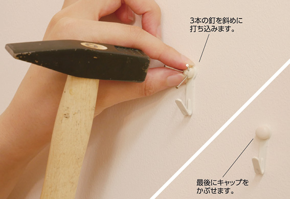 石膏ボードや中空の壁に直接打ち付けるだけ。取り外しも簡単にできます。