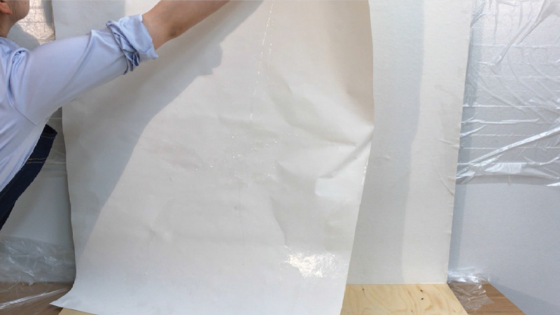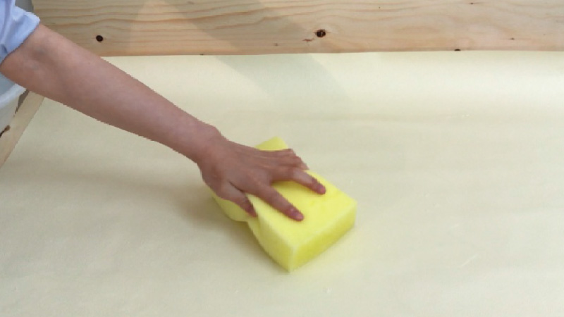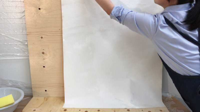 ①-2. 壁紙の裏にスポンジなどで水をたっぷりと付け、のりが戻るまで3~4分そのままおきます。