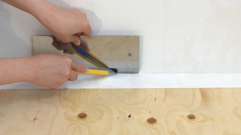 ⑥ 壁紙の継ぎ目は、重なっている中央部分に印を付け、定規をあてて2枚同時にカッターで切ります。上に重なった2枚目の壁紙と奥の1枚目の壁紙をはがします。