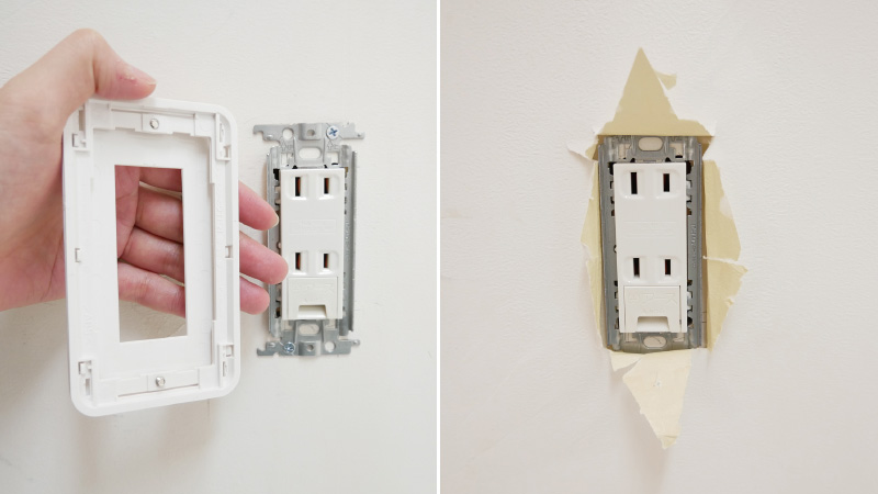 壁紙を貼る前にプレートはあらかじめ外しておきます。貼り終わった壁紙の上から指でプレートの位置を確認し、×印に切り込みを入れて四角く切り抜き、プレートを取り付けます。