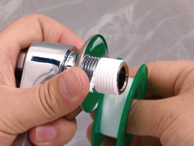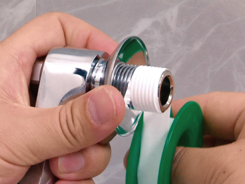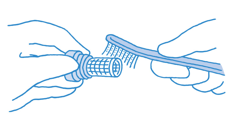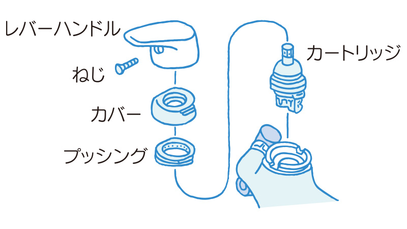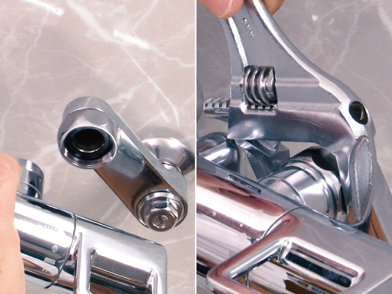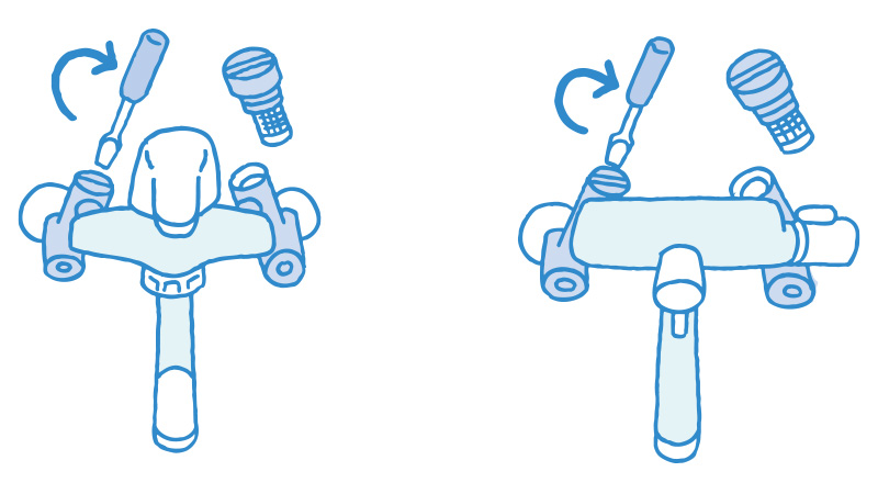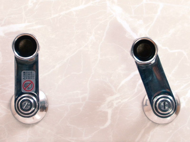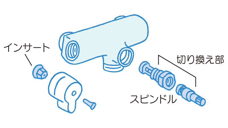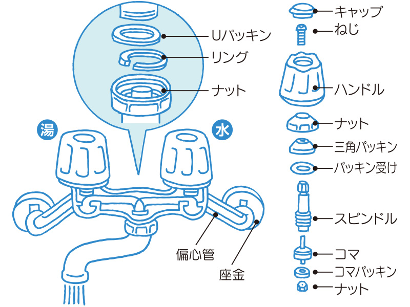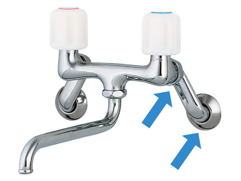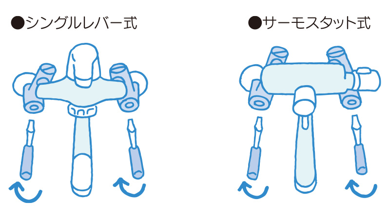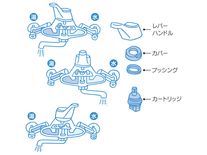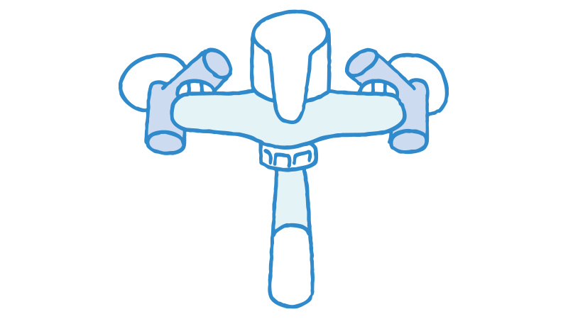 単水栓が2つ並び、それぞれの栓で調節された湯と水が中央で混ざるタイプ。古くなって汚れてきたら、次の手順で交換します。