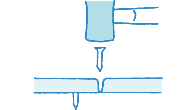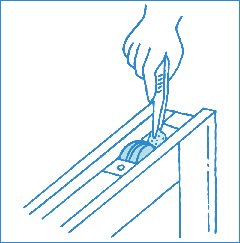 木ねじの穴が緩んでいる時は、細く削った竹箸に木工用の接着剤を付け、穴に打ち込みます。不必要な部分をカッターで切った後、乾燥させて新しい戸車を取り付けます。