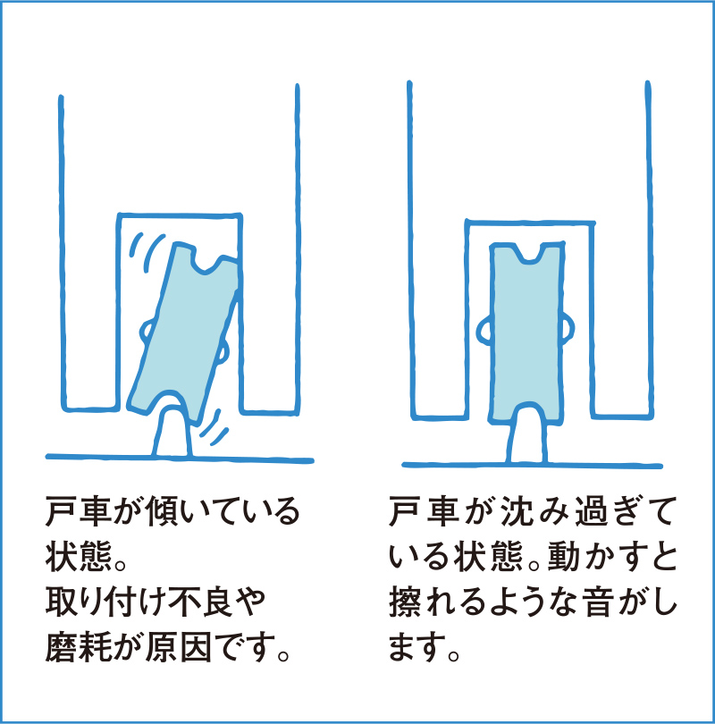 引き戸の戸車の寿命は3〜4年。開け閉めのたびにガタガタ音がしたり、引っ掛かってきたら、交換が必要です。またレールのさびも点検しましょう。
