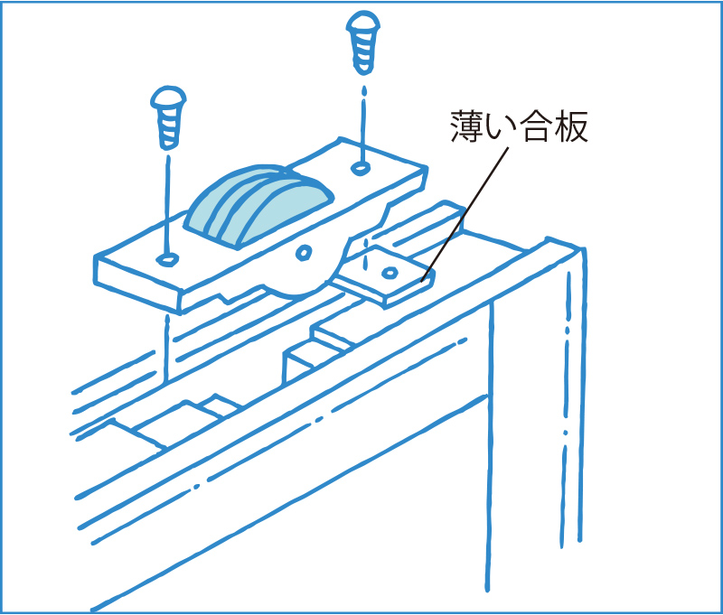 戸車が沈み過ぎている時は、薄い合板を挟んで高さを調節します。左右どちらかに傾いている時も、高さ調節のために片側に薄い合板を挟みます。