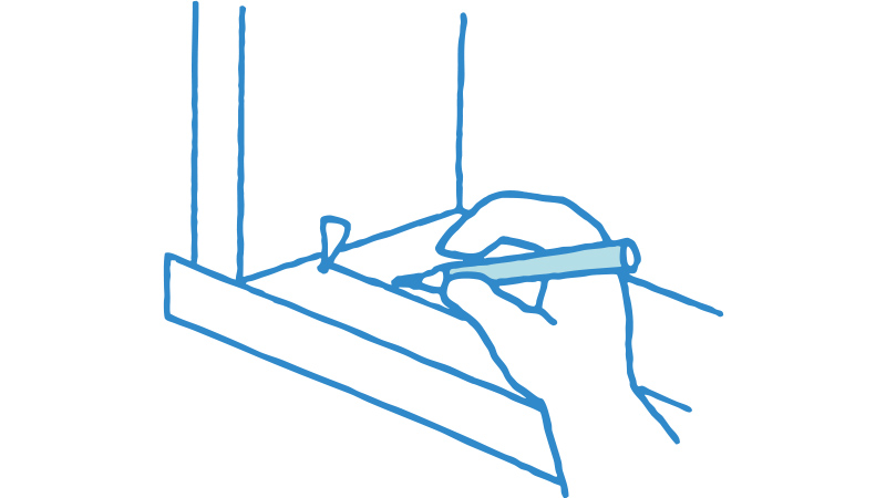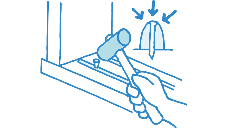 [3]新しいレールは長さ2㎝くらいの釘で、45㎝間隔で開いている釘穴に打ち込みます。木部の古い釘穴に合わないように注意。