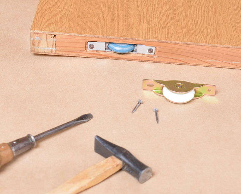 戸車を調べて、摩耗しているなら早めに交換を。戸車は止めているねじを外せば簡単にとれます。サイズや材質が何種類かあるので、古い戸車を持って行き、同じものを購入すれば間違いがありません。ここでは戸車の沈み過ぎや傾きを直す方法を紹介します。