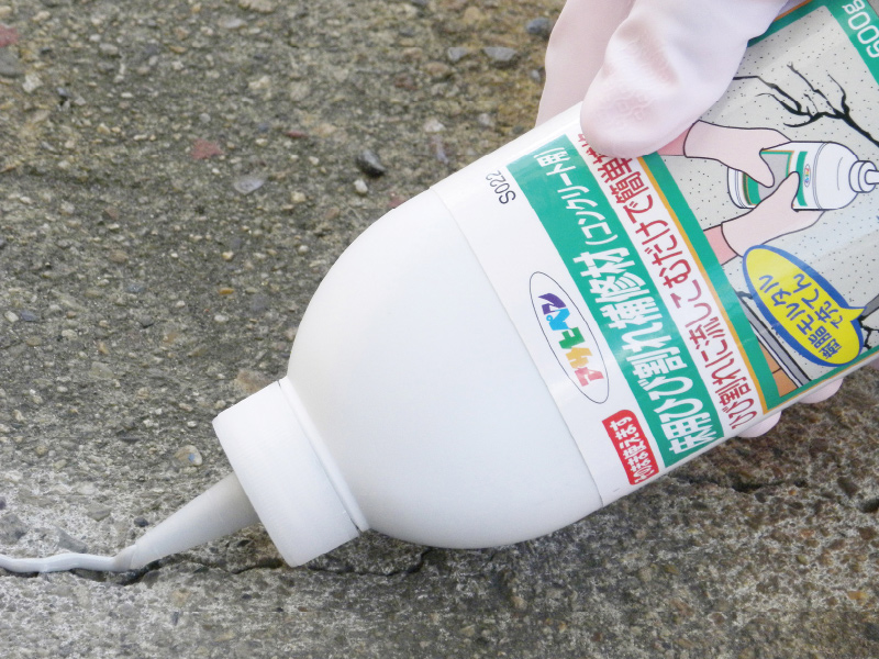 ② 1回の使用分だけFRP用ポリエステル樹脂と硬化剤を100:3の割合で混ぜ合わせて混合液をつくり、補修箇所に塗布します。 この時、水とは絶対に混ぜないように注意してください。また、30分ほどで硬化しますので、使う分だけ少しずつ混ぜ合わせてください。 ※刷毛やローラーなどはアセトンで洗浄してください。