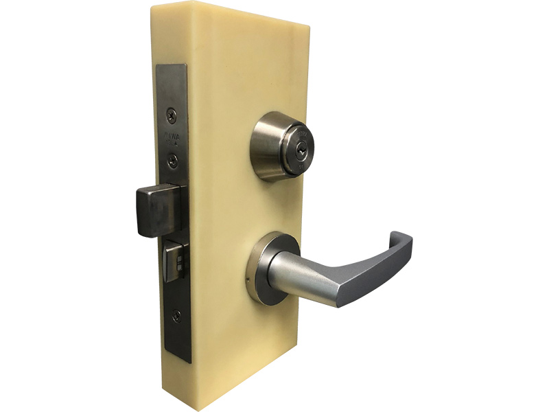 ノブと鍵穴が別の位置にあり、錠本体がドアの中に格納されているタイプ。戸建てやマンションのアルミ製の玄関ドアに使われています。