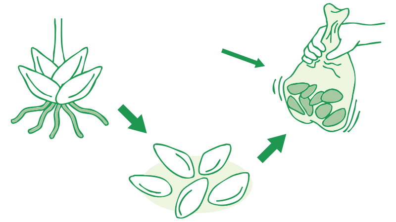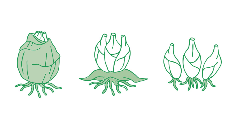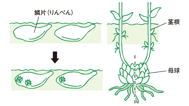 ユリは母球が分球するほか、茎根の発生する箇所に木子が、地上部の葉の付け根に珠芽(むかご)が発生します。母球から分球した大球根は翌年に開花し、木子や珠芽などの小球根は植え付けておくと苗が得られます。グラジオラスやフリージアは、子球が肥大したころには母球は消耗してしまうので、子球のみを繁殖に使います。またダリアは塊根で肥大した根の1つずつが分球の対象となります。ただし、どの塊根にも必ず首部にある芽を付けて切り分けなければならないので、多少熟練を要します。