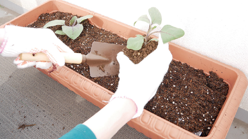 プランターの水抜き穴キャップをとります。水が流れるように少し傾けて置き鉢底にネットを敷きます。赤玉土大粒など、用土を薄く掛けて、元肥になる油かすを一握り入れ再び用土を入れます(元肥入りの培養土なら不要です)。深さ10cmほどの穴を等間隔で開けて苗を傷めないように注意しながら植え付けます。65cmプランターなら2株が目安です。鉢底から流れ出るくらいの水をたっぷりと与えます。