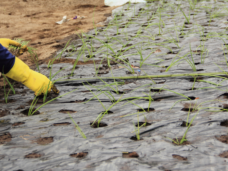ポリまたはビニールのシートを畝伝いに敷き、植える位置に穴を開けて苗を植えます。<必要な野菜苗>なす・トマト・すいか・きゅうり・ピーマンなど<効果>・春先、地面の温度を上げる。・遅霜から守る。・防風・防寒の効果がある。・タネバエの幼虫による被害から守る。
