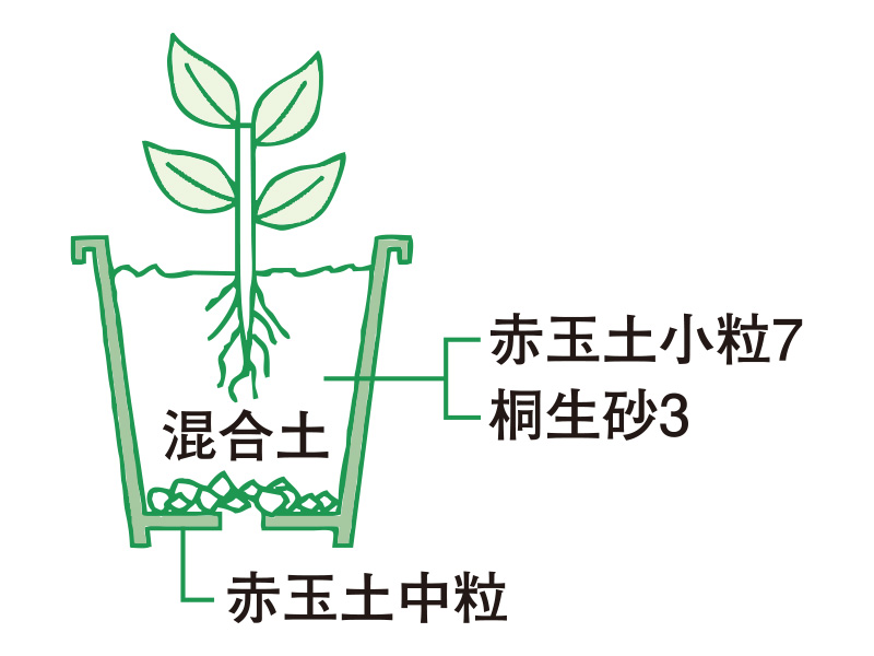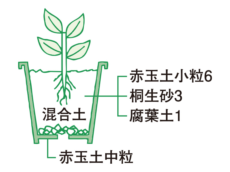 9月上旬~10月下旬までが適期です。最初から大きな鉢に植えるより、1回目は3~4号鉢、2回目は5号鉢というように、苗木の生育に合わせて植え替えるとよく育ちます。用土は一般的に赤玉土と桐生砂を混ぜたもの、鉢底石には赤玉土の中粒を使用します。●観葉植物