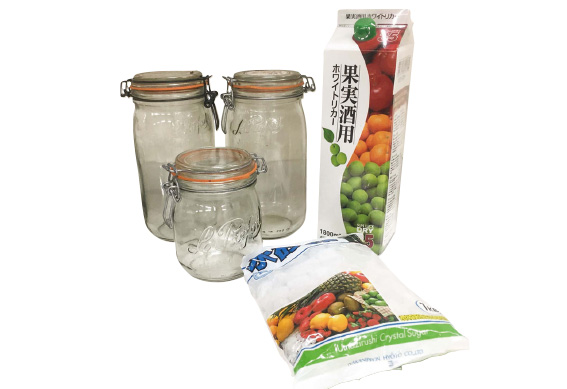 果実酒づくりの魅力は、手づくりのおいしさとその手軽さ。用意するものは果実などと、砂糖・容器・35度以上の甲類焼酎(ホワイトリカーなど)。これらの材料を吟味することで、果実酒のまろやかなおいしさが増します。