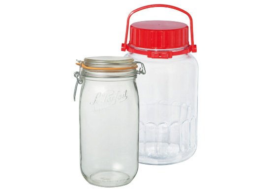 密閉びんはアルコールで消毒し、よく乾燥させます。広口びんの目安3号 ‥‥‥‥‥ 2ℓ5号 ‥‥‥‥‥ 4ℓ7号 ‥‥‥‥‥ 5ℓ耐熱びんの場合は、熱湯消毒もおすすめです。