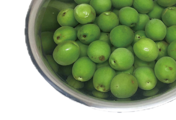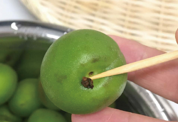 青梅は新鮮で無傷なものを選び、黄色くなったものは避けます。実は1粒ずつきれいに水洗いし、ざるに上げます。乾いた布で、ていねいに水気を拭きとります。ヘタは竹串などで取り除き、くぼみの汚れもよく落とします。