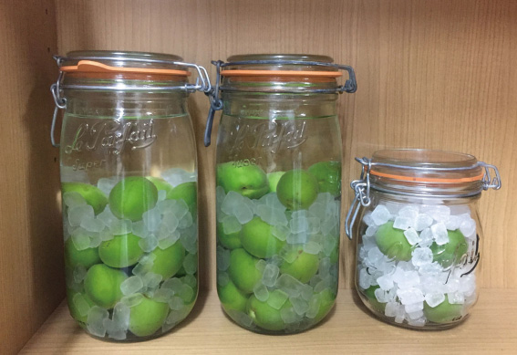 (密閉びん5号(4ℓ)を使用の場合)◎青梅……1kg◎氷砂糖……200~500g はちみつなら2カップ 果糖なら1割減◎35度 甲類焼酎 ホワイトリカー………1.8ℓ