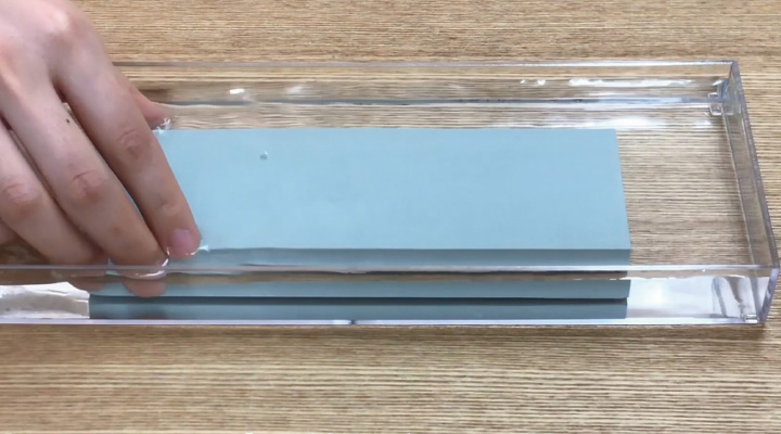 ① 砥石を5〜10分くらい水につけ、十分水を含ませます。