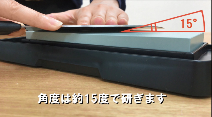 ①包丁を砥石に斜めに置き、左手をぴったり揃えて刃を押します。②角度は10円玉が2枚ほど納まるくらい(約15°)にします。