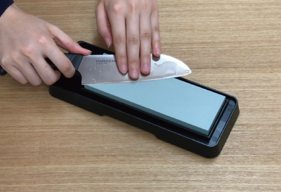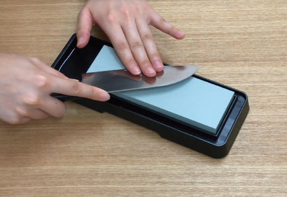 ②研ぐ前に合成砥石:使用前に、少なくとも5分〜10分くらいは水につけてから研ぎます。ただし、つけっ放しにしておくと、ヒビ割れの原因になります。天然砥石:水を掛けながら研ぎます。水につけておくと割れることがあるので注意が必要です。