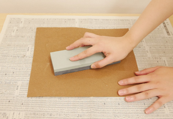 ③表面はいつも平らに(砥石のお手入れ)砥石は使用後、水でよく洗い、日陰に干して乾かします。砥石は水につけっ放しにしたり、日光に長く当てると、ひび割れなどの原因になります。表面に凸凹があると、きれいに研げません。長い間使用しているうちに、砥石の中心がくぼんできたら、サンドペーパー(#80〜100)を平らな面に敷いて、水をつけながら砥石面を削り修正します。