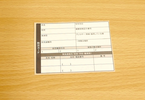 貯金通帳や健康保険証・証書などはコピーをとって入れておきます。現金は3万円くらい。公衆電話用に10円玉を用意しておきましょう。