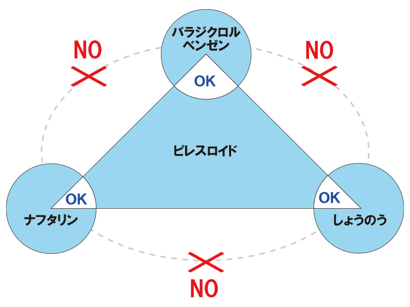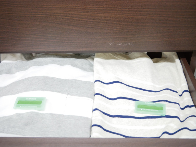 A:防虫剤から発生するガスは空気より重いので上から下におりていきます。ですから防虫剤は、衣類の上部に置くのが効果的です。洋服だんす用・クローゼット用などの吊り下げタイプは左右に掛けましょう。いずれの場合も衣類を入れ過ぎないよう注意しましょう。※密閉容器に入れるとより効果的です。