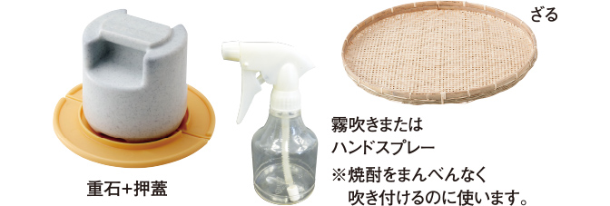 均一に重量がかかるように押蓋が必要となります。金属でないものを使います。