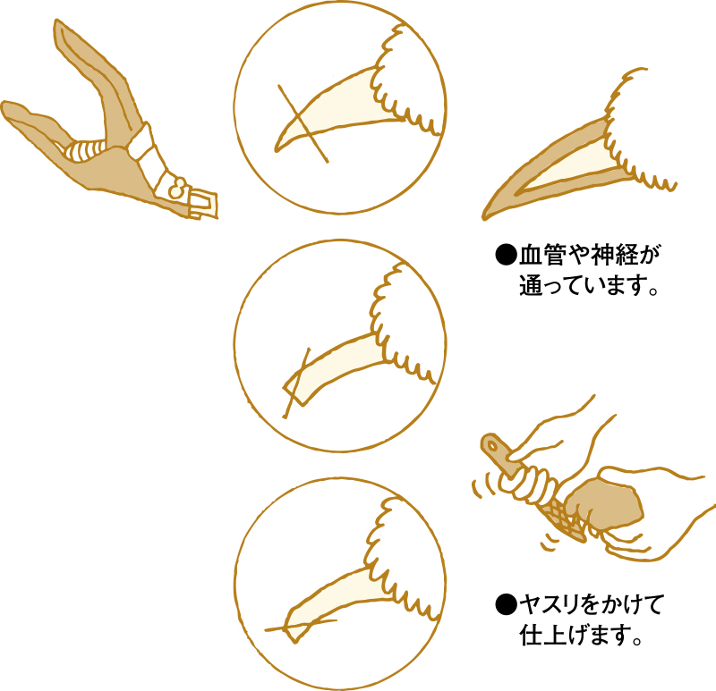 一度でも痛い思いをさせると、二度目から触らせてくれなくなるので、初めが肝心です。道具を見せたり、少し切って痛くないことをわからせて慣らしてください。