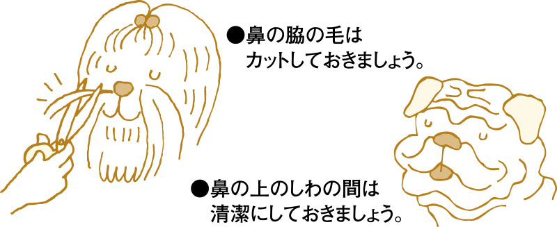 長毛種の場合は、鼻が毛に埋もれないようにカットしてあげてください。パグやブルドッグなどは鼻の上のしわの間が汚れやすいので、お手入れを忘れないようにしてください。