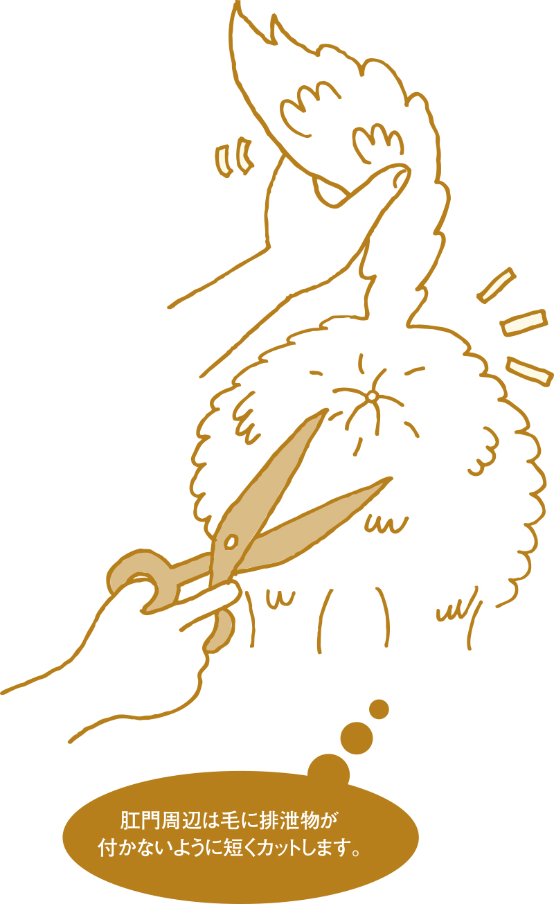 肛門周辺は、短毛種も長毛種も、毛に排泄物が絡み付かないように短く刈ります。またシャンプーの時以外にも、時々肛門腺を絞ります。長く放っておくと液が飛び出して悪臭の原因になったり、肛門炎を起こすこともあります。