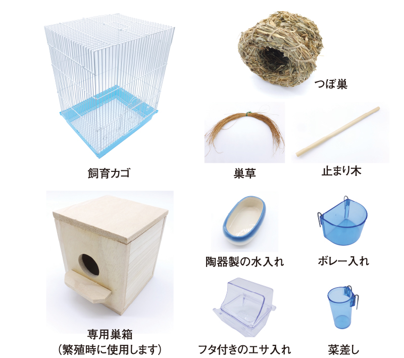 | 飼育カゴ | 観賞用には中型の金網カゴが良いでしょう。産卵させてひなを飼うなら大型の庭箱が理想的です。 |